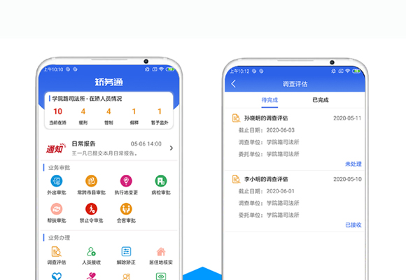 利用互聯網及相關先進技術,將社區矯正系統延伸到移動端。參照標準體現規范,研制“在矯通"、“矯務通"、 "協矯通”APP等,實現社區矯正"工作在掌上.管理在指尖"的移動式管理,提升社區矯正工作的便捷性。