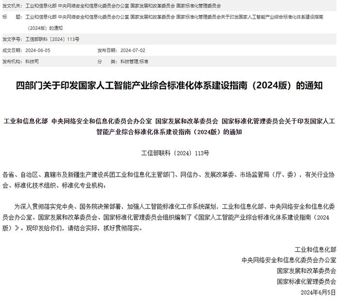 為深入貫徹落實黨中央、國務院決策部署,加強人工智能標準工作系統謀劃,工業和信息化部、中央網信辦、國家發展改革委、國家標準委等四部門近日聯合印發《國家人工智能產業綜合標準化體系建設指南(2024版)》。提出到2026年,我國標準與產業科技創新的聯動水平持續提升,新制定國家標準和行業標準50項以上,引領人工智能產業高質量發展的標準體系加快形成。開展標準宣貫和實施推廣的企業超過1000家,標準服務企業創新發展的成效更加凸顯。參與制定國際標準20項以上,促進人工智能產業全球化發展。