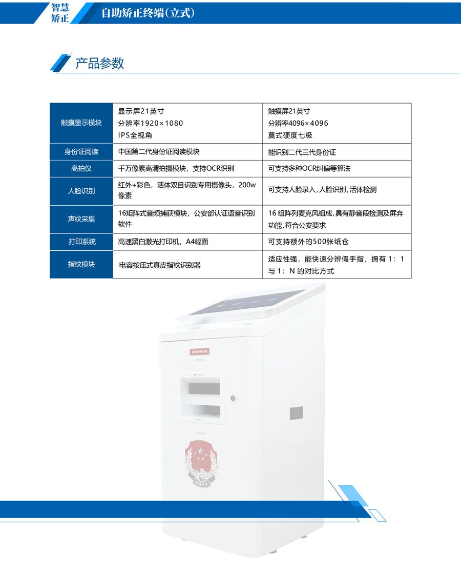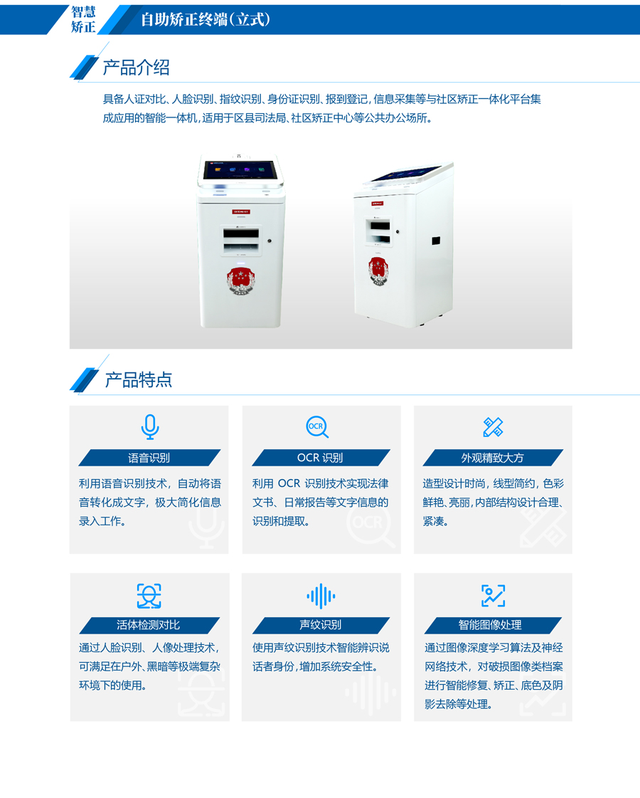 具備人證對比、人臉識別、指紋識別、身份證識別、報到登記、信息采集等與社區(qū)矯正一體化平臺集成應(yīng)用的智能一體機(jī),適用于區(qū)縣司法局、社區(qū)矯正中心等公共辦公場所。