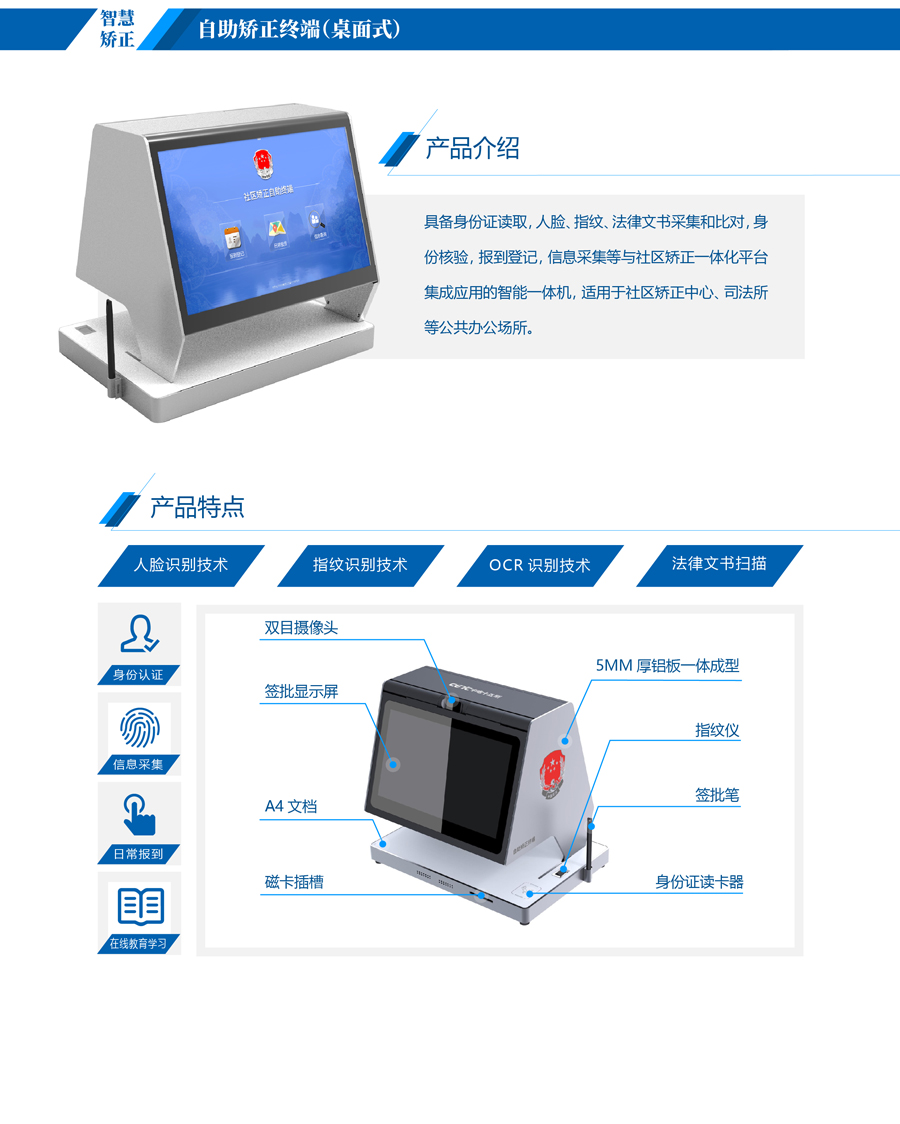具備身份證讀取、人臉、指紋、法律文書采集和比對,身份核驗、報到登記、信息采集等與社區矯正一體化平臺集成應用的智能一體機,適用于社區矯正中心、司法所等公共辦公場所。