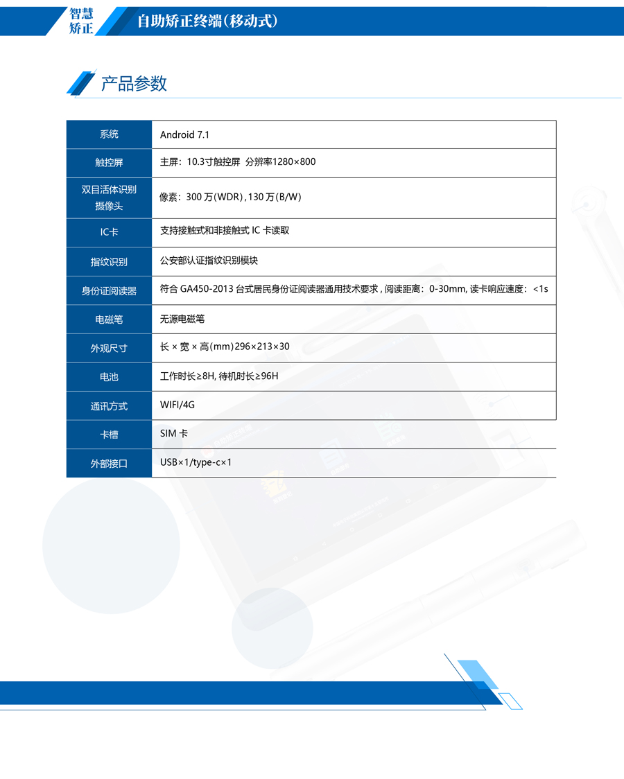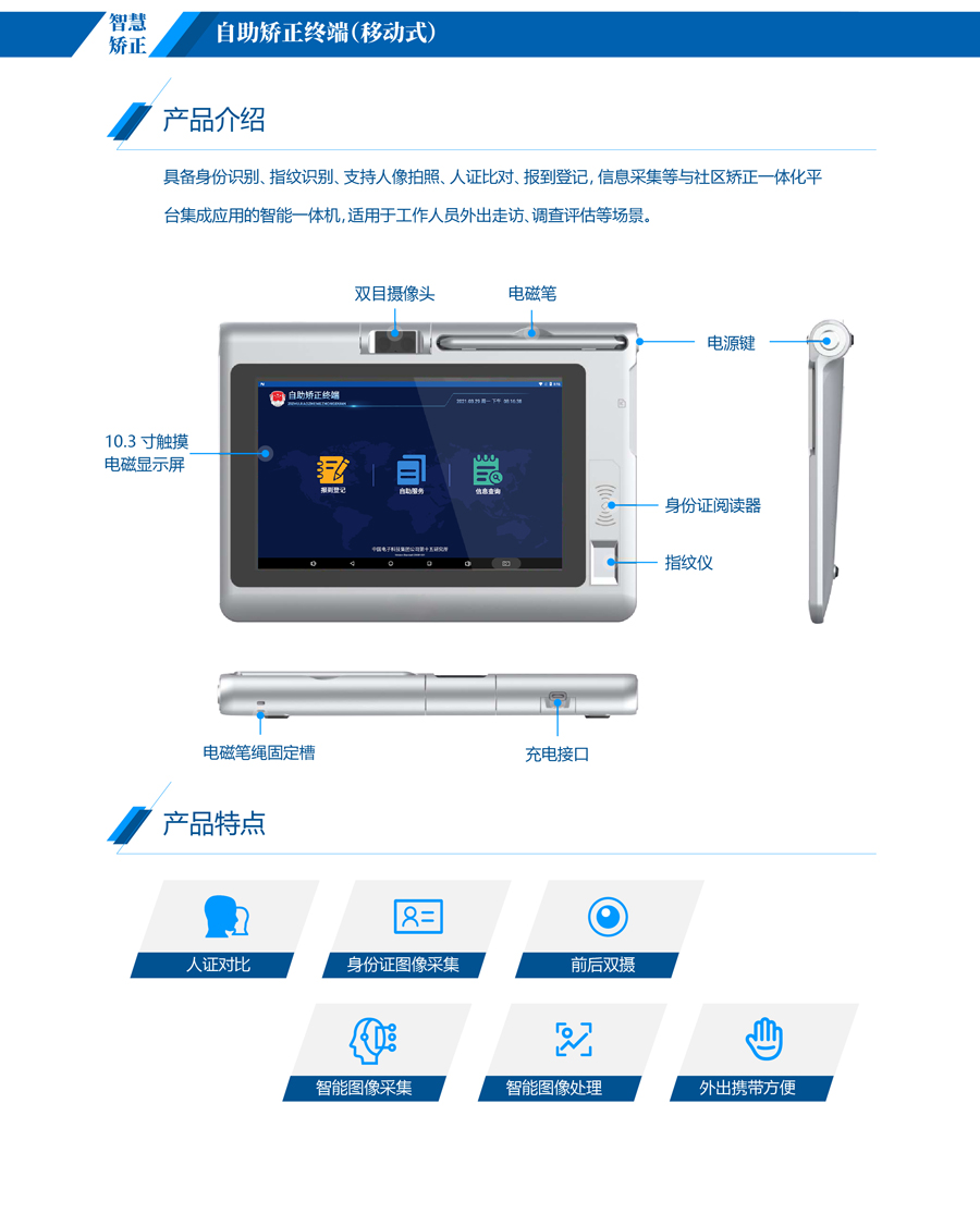 具備身份識別、指紋識別、支持人像拍照、人證比對、報到登記、信息采集等與社區矯正一體化平臺集成應用的智能一體機,適用于工作人員外出走訪、調查評估等場景。