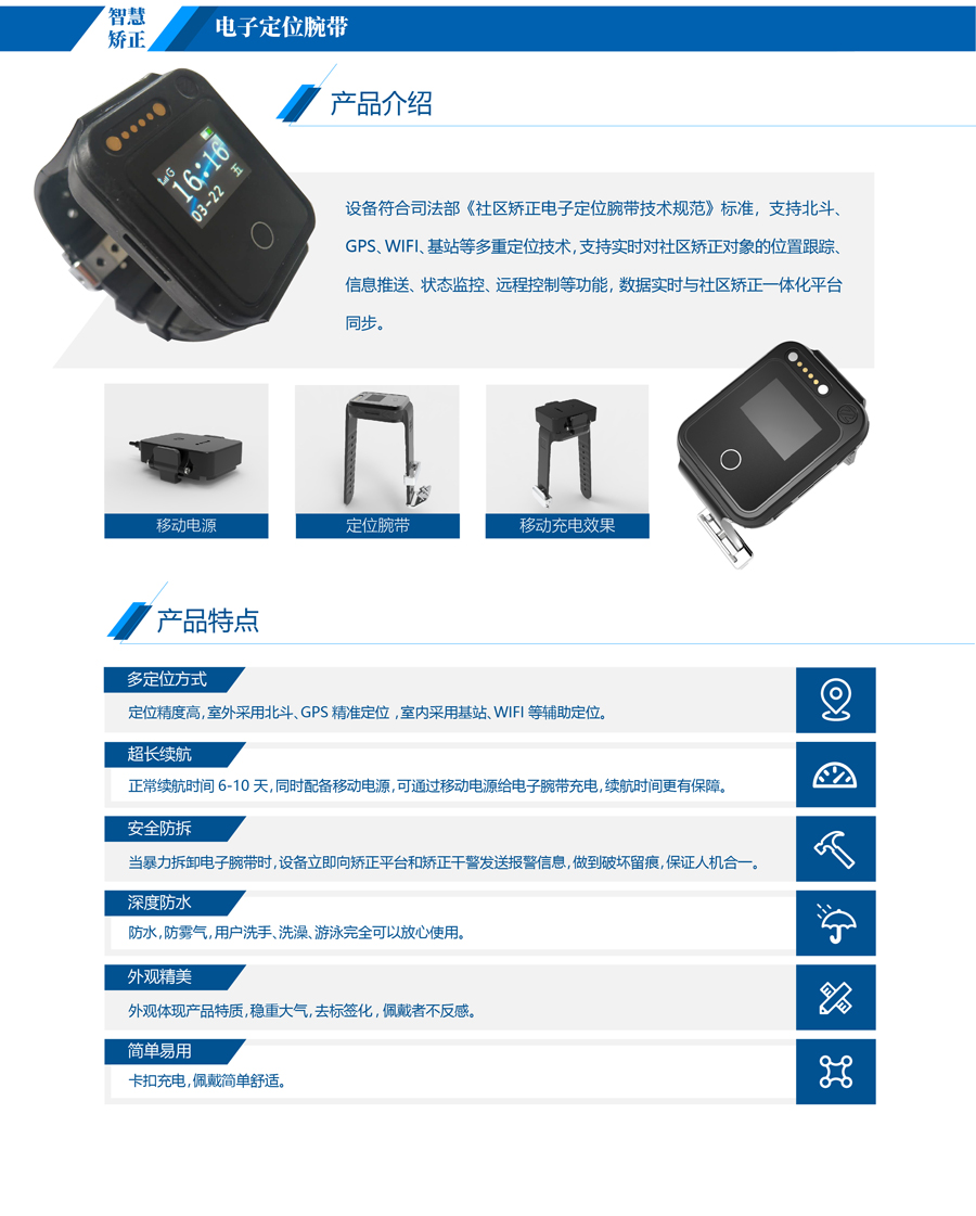 設備符合司法部《社區矯正電子定位腕帶技術規范》標準,支持北斗GPS、WIFI、基站等多重定位技術,支持實時對社區矯正對象的位置跟蹤、信息推送、狀態監控、遠程控制等功能,數據實時與社區矯正一體化平臺同步。